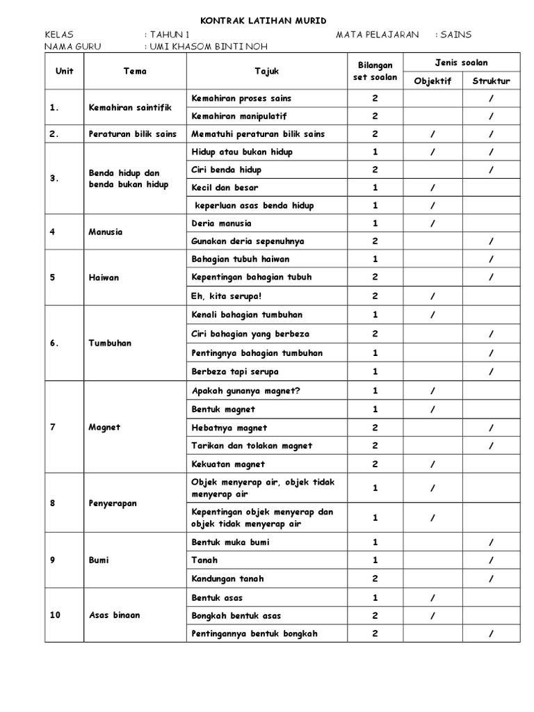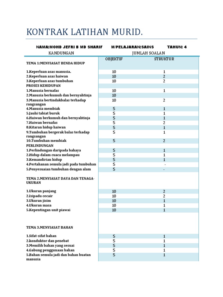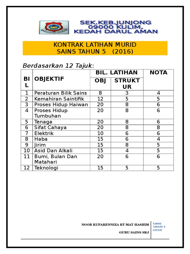 BORANG KONTRAK LATIHAN MURID BAHASA INGGERIS TAHUN 5 2017 BIL TARIKH TAJUK BILANGAN JUMLAH SOALAN SET LATIHAN OBJEK STRUK ESE TIF TUR I 1 1-5 WORLD OF SELFFAMILY E 1- GrammarVocabulary x 10 x Jan2017 AND FRIENDS UNIT 1 Comprehension 2 8-12 FAMILY DAY E2 Social Expression x 10 x Jan2017 E 3 Text completion x 10 x E 4. KONTRAK LATIHAN SAINS TINGKATAN 5 Topik Subtopik Bilangan set soalan Sumber Objektif Subjektif Esei Bab 1. Melalui penggunaan ICT para guru boleh memaksimumkan penambahan perkongsian pembelajaran secara online sama ada pembelajaran secara jarak.